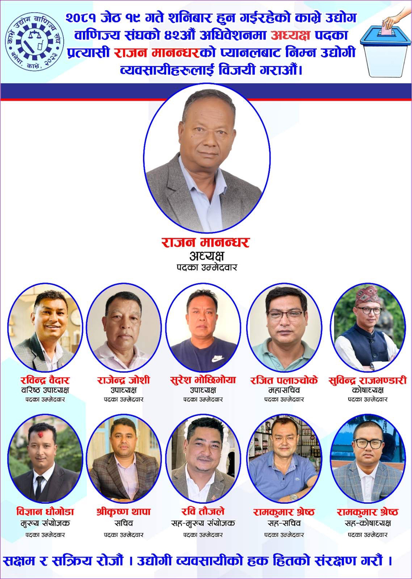 संघमा उद्योगी व्यवसायीहरु प्यानल बनाएर चुनावी मैदानमा उत्रिएका छन् । त्यसमध्ये बलियो प्यानल मानिएको उद्योगी व्यवसायीहरुको साझा प्यानल राजन मानन्धर नेतृत्वको समूहबाट वरिष्ठ उपाध्यक्षमा परिचित व्यवसायी रविन्द्र वैदारले वरिष्ठ उपाध्यक्षमा उम्मेदवारी दर्ता गराएका छन् ।