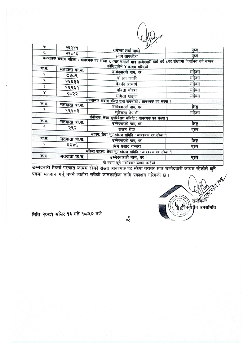 लेखा सुपरिवेक्षण समिति संयोजकमा राजन श्रेष्ठ तथा सदस्यमा भीम प्रसाद बञ्जारा निर्वाचित हुँदा लेखा सुपरिवेक्षण समितिको महिला सदस्यमा कसैको पनि उम्मेदवारी कायम नरहेको निर्वाचन उपसमितिले जनाएको छ ।
