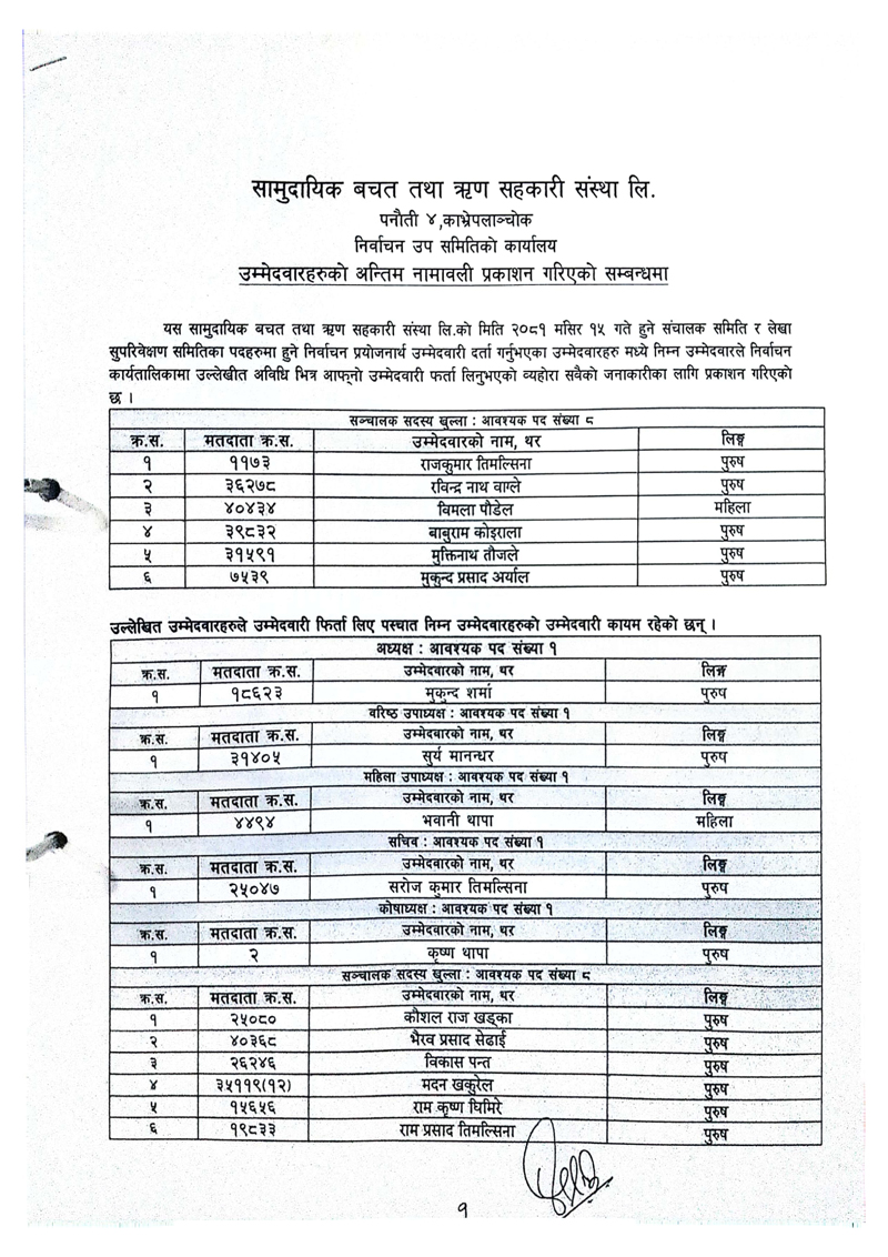पनौती–काभ्रेकै ठूलो सहकारी संस्था सामूदायिक बचत तथा ऋण सहकारी संस्थाको सञ्चालक समिति निर्विरोध निर्वाचित भएको छ ।