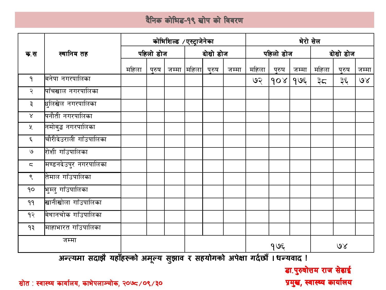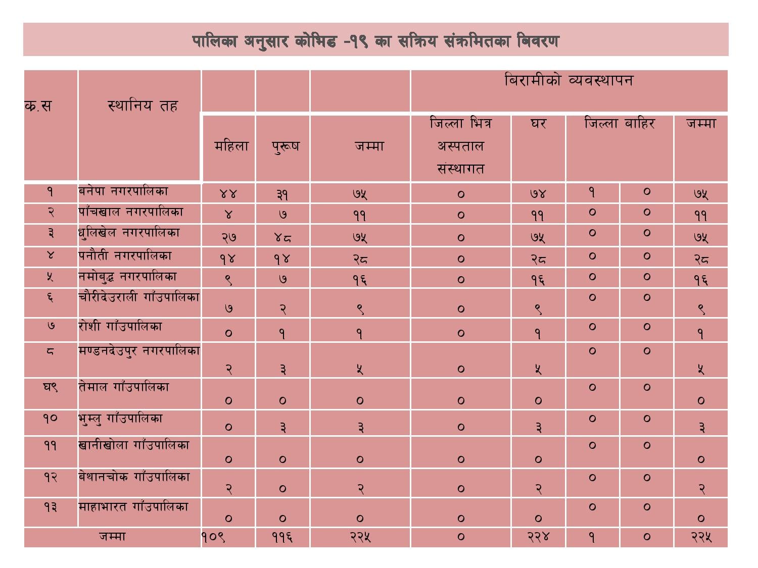 जिल्लामा सबैभन्दा बढी बनेपा र धुलिखेल नगरपालिकामा ७५÷७५ जना सक्रिय संक्रमित रहेका छन् । हाल खानीखोला, महाभारत र तेमाल गाउँपालिकामा संक्रमितको संख्या शुन्य रहेको छ । कुल सक्रिय संक्रमितमध्ये १ जना जिल्लाबाहिर रहेका छन् भने २ सय २४ जना घरमै आराम गरिरहेका छन् । पछिल्लो २४ घण्टामा २२ जना कोरोना संक्रमित निको भएको स्वास्थ्य कार्यालय काभ्रेले जनाएको छ ।