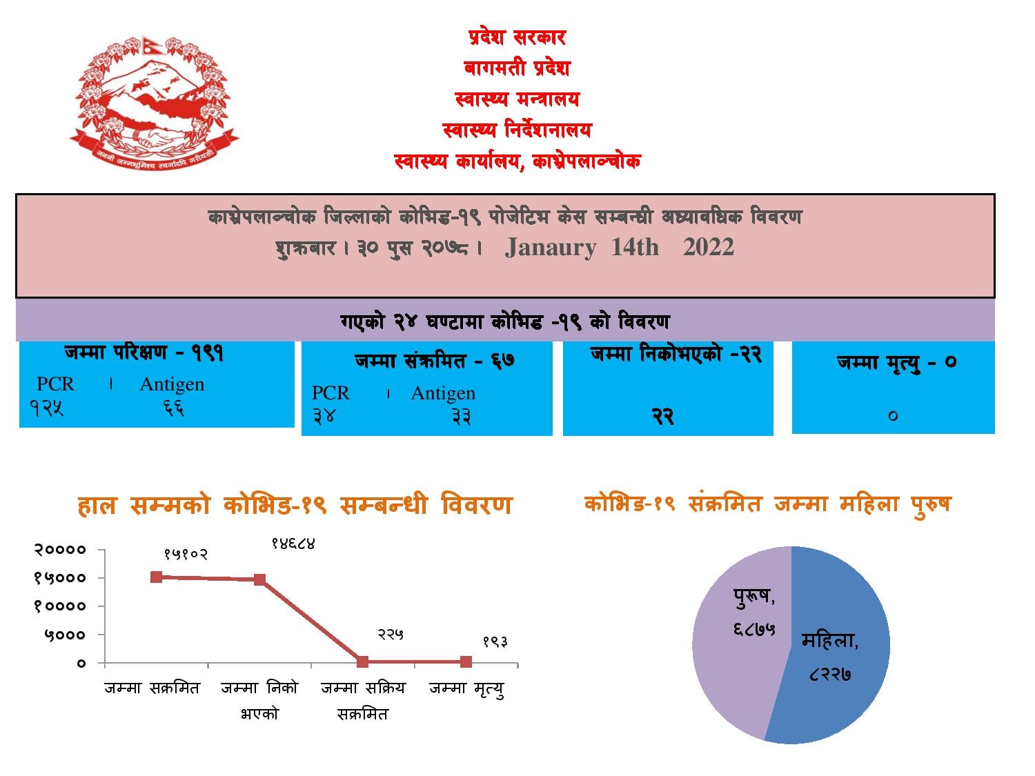 आजमात्रै काभ्रेमा ६७ जना कोरोना संक्रमित थपिएका छन् । जिल्ला स्वास्थ्य कार्यालय काभ्रेका अनुसार पछिल्लो २४ घण्टाको अवधिमा गरिएको एन्टिजेन र पिसिआर परिक्षणबाट ६७ जनामा कोभिड १९ पोजेटिभ देखिएको हो । पछिल्लो २४ घण्टामा १२५ जनाको पिसिआर र ६६ जनाको एन्टिजेन गरी १ सय ९१ जनाको परिक्षण गरिएको थियो । त्यसमध्ये ६७ जनामा पोजेटिभ देखिएको जिल्ला स्वास्थ्य कार्यालय काभ्रेले जनाएको छ । यससँगै काभ्रेमा कोभिड १९ का सक्रिय संक्रमितको संख्या २ सय २५ पुगेको छ ।