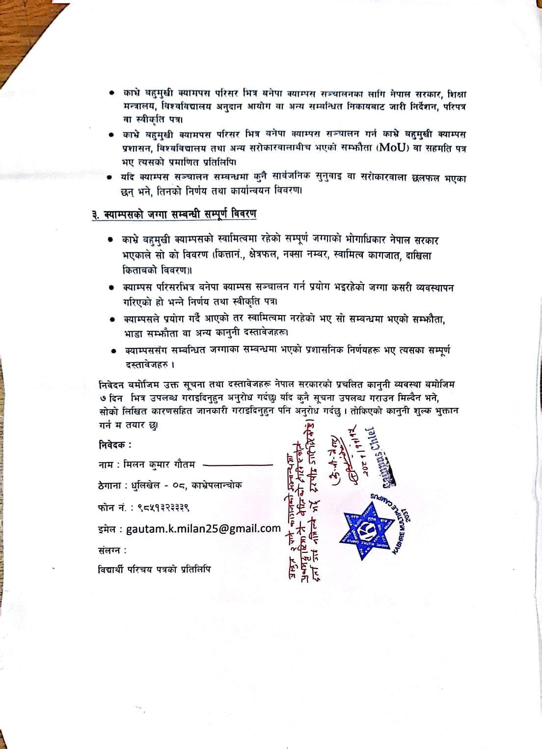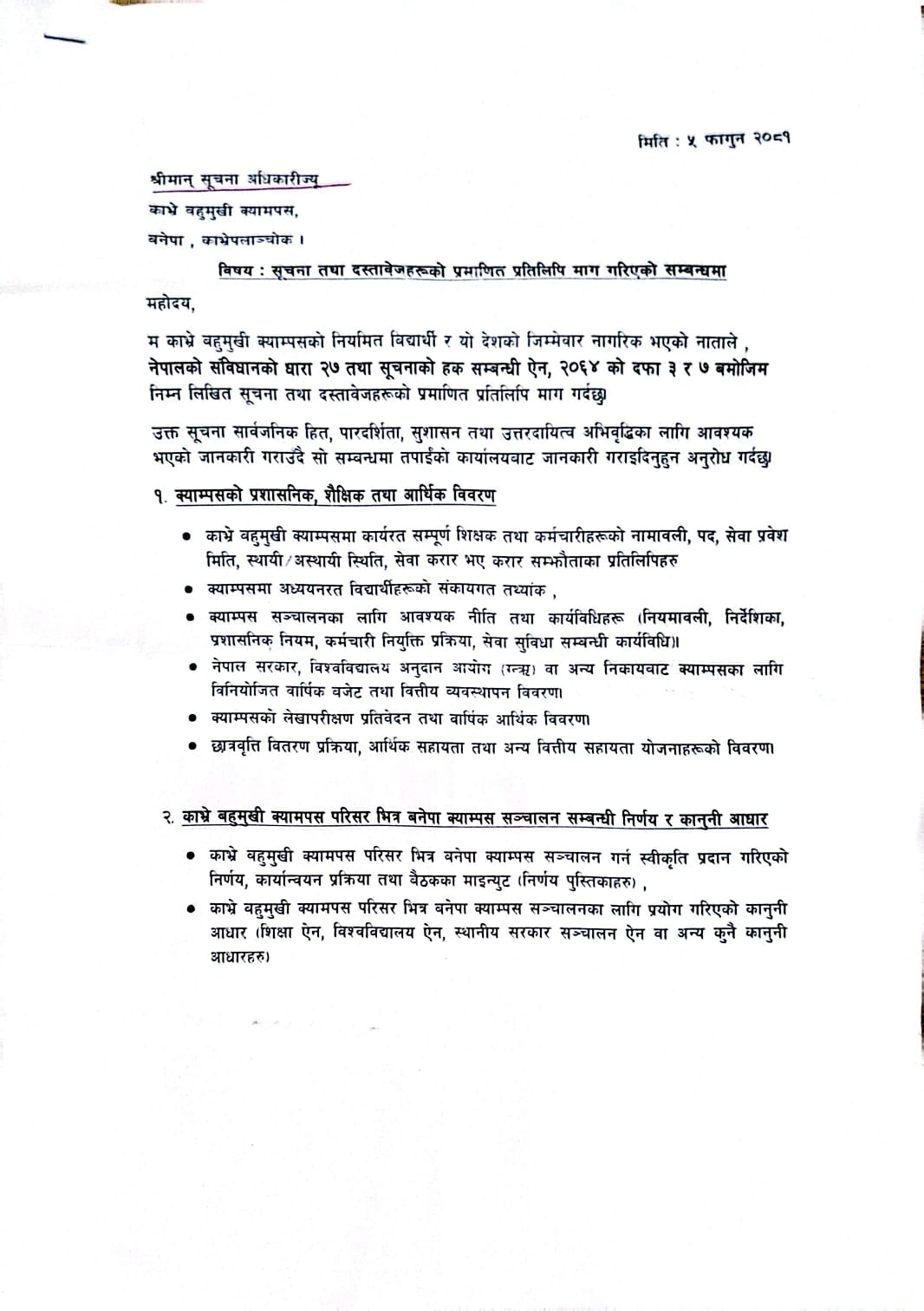 गौतमले क्याम्सपको प्रशासनिक, शैक्षिक तथा आर्थिक विवरण, काभ्रे बहुमुखी क्यामपस परिसर भित्र बनेपा क्याम्पस सञ्चालन सम्बन्धी निर्णय र कानूनी आधार र क्याम्पसको जग्गासम्वन्धी सम्पुर्ण विवरण माग गरेका थिए ।