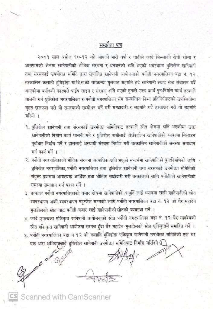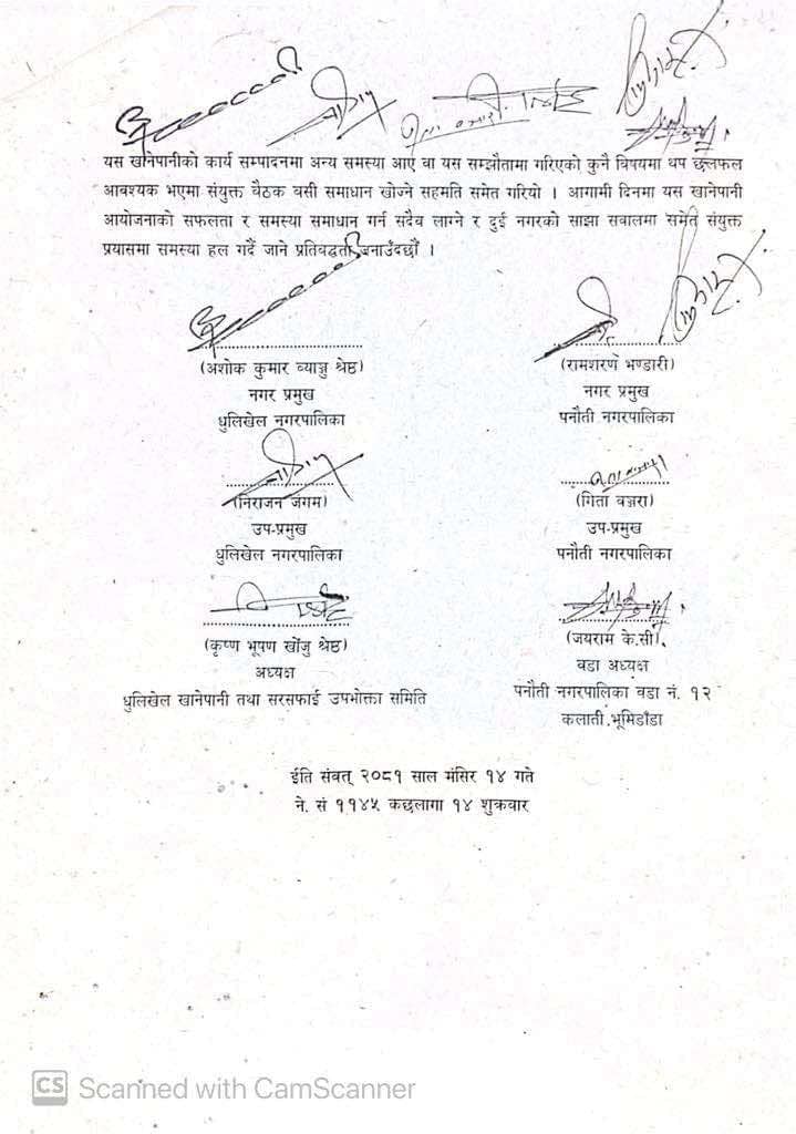 पनौती १२ बाट धुलिखेल ल्याइएको खानेपानी आयोजना सुचारु गर्न आज सहमति भएको हो । सहमतिपत्रमा धुलिखेल नगरपालिकाका प्रमुख अशोक व्याञ्जू, पनौती नगरपालिकाका प्रमुख रामशरण भण्डारी, धुलिखेल नगरपालिकाका उपप्रमुख निराजन जंगम, पनौतीकी उपप्रमुख गीता बन्जारा, धुलिखेल खानेपानी तथा सरसफाई उपभोक्ता समितिका अध्यक्ष कृष्णभुषण खोजू श्रेष्ठ र पनौती नगरपालिका वडा नं. १२ का वडा अध्यक्ष जयराम केसीले हस्ताक्षर गरेका छन् ।