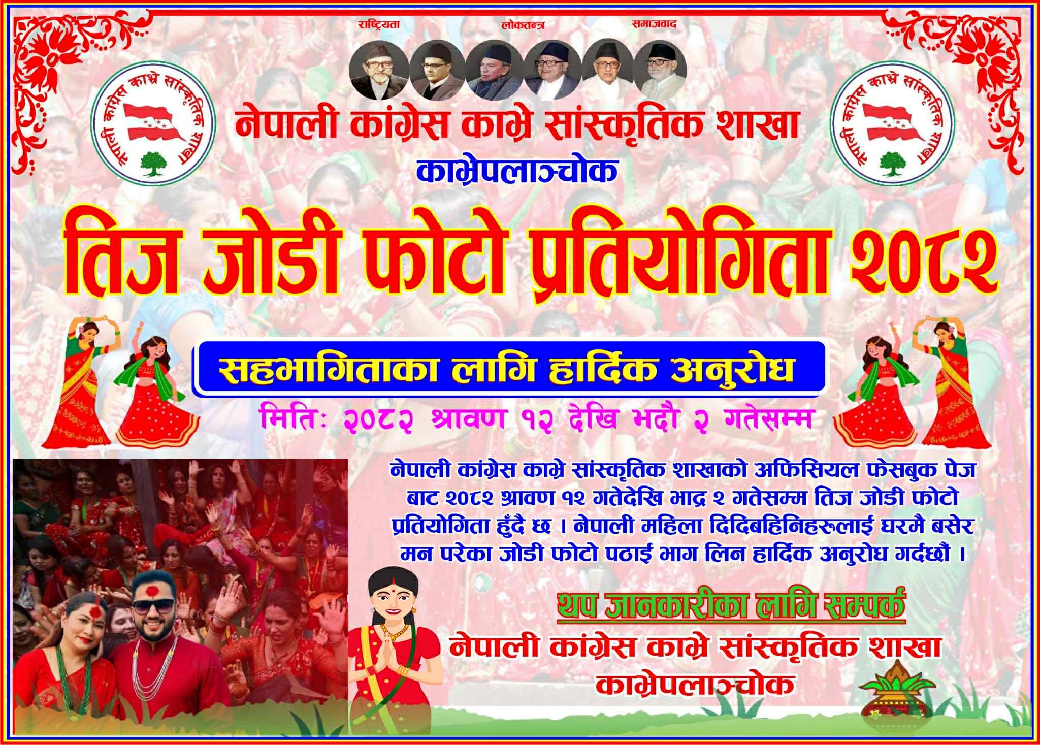 काभ्रे-काभ्रेमा तीज जोडी प्रतियोगिता हुने भएको छ । नेपाली कांग्रेस काभ्रेको सांस्कृतिक शाखाले “तीज जोडी फोटो प्रतियोगिता–२०८२” आयोजना गर्न लागेको हो ।