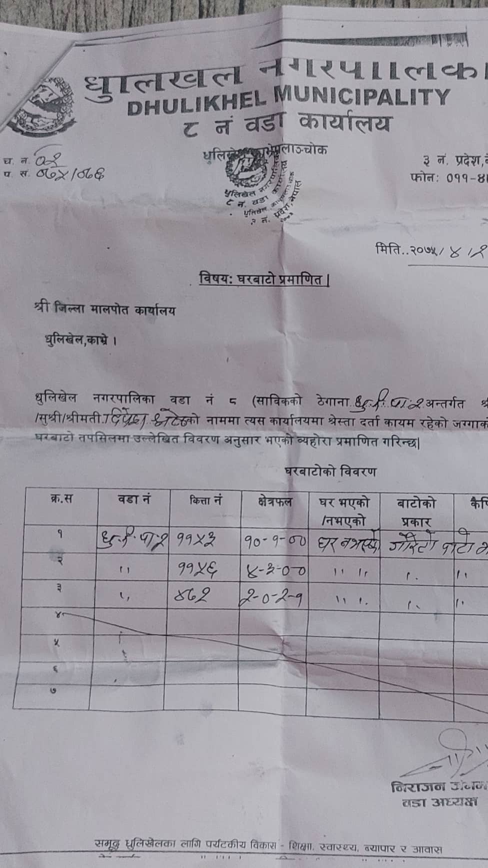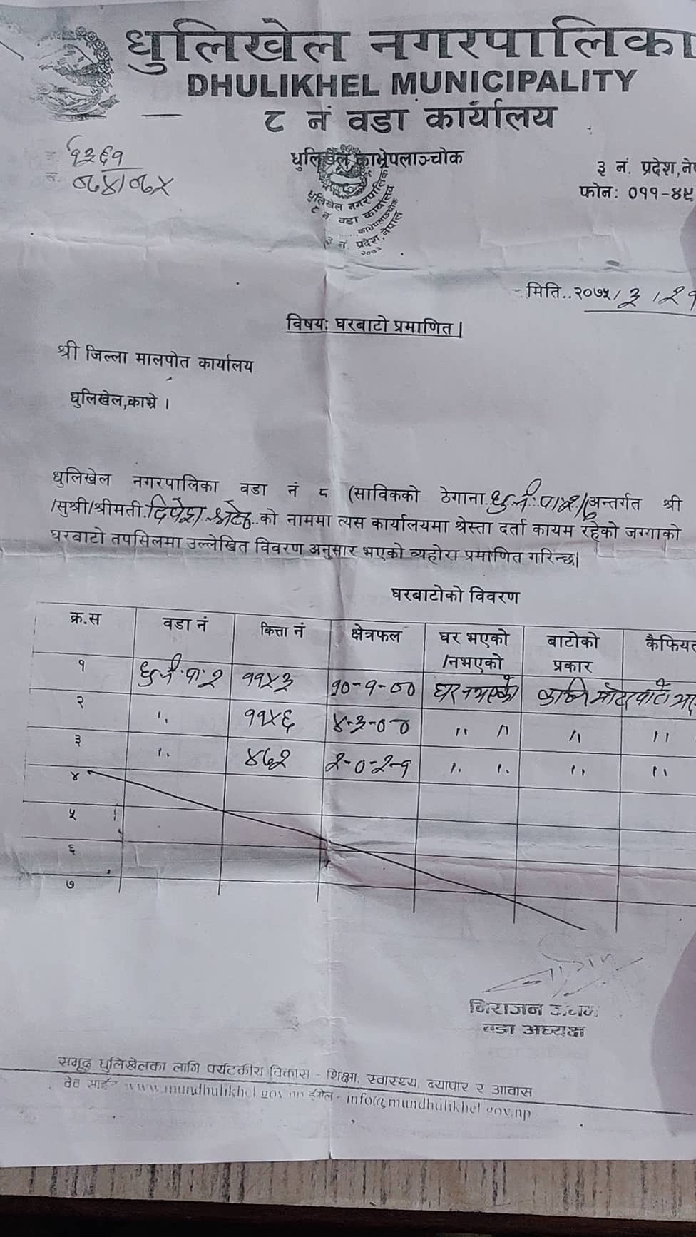 वडा अध्यक्ष रहँदा जंगमले २०७५ साल असार २१ गते १३६१ चलानी नम्वर भएको आब २०७४/२०७५ मा घरबाटो सिफारिसका लागि साविक धुलिखेल नगरपालिका वडा नम्वर २÷७ को कित्ता नम्वर ११५३ को १० रोपनी १ आना, ११५६ को ४ रोपनी ३ आना र ४७२ को २ रोपनी २ दाम १ आना जग्गामा घर नभएको तर कच्चि मोटर बाटो भएको प्रमाणीत गरेका छन् । जसका कारण दिपेश श्रेष्ठले नगरपालिकाले कायम गरेको प्रति आना कच्ची मोटर बाटोको मुल्यांकनमा प्रति आना २ लाख ५५ हजारका दरले पास खर्च राजश्व १३ लाख ५७ हजार रुपैया र लाभकर साढे ४ प्रतिशतका दरले १५ लाख ७ हजार गरी कुल २८ लाख ६४ हजार रुपैया तिर्नु पर्छ ।