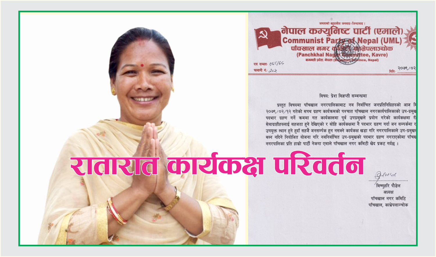 पाँचखाल–पाँचखाल नगरपालिकाकी नवनिर्वाचित उपप्रमुख सूर्यमाया दनुवारले सपथ ग्रहण गरेकै दिन विभेदको सामना गर्नुपरेको छ । आज बिहान नगरपालिकामा सपथ लिएपछि दनुवारले आजै पदभार सम्हा...