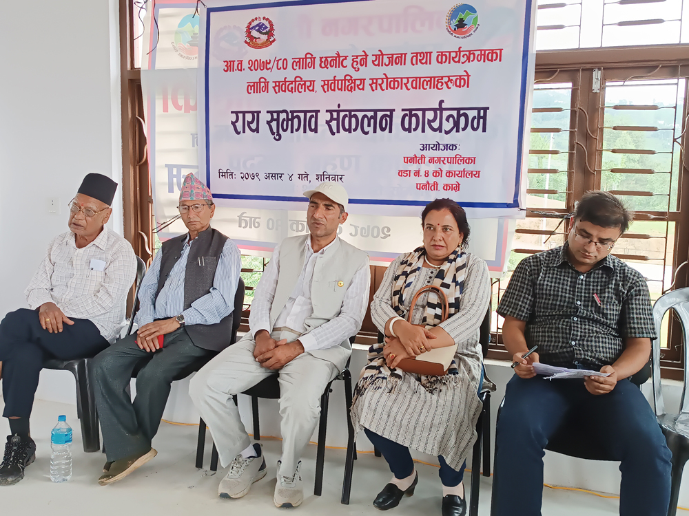 पनौती – पनौती नगरपालिका वडा नम्बर ४ ले वडावासीको सुझाव संकलन गरेको छ । आर्थिक वर्ष २०७९÷८० को लागि छनौट हुने योजना तथा कार्यक्रमका लागि सर्वदलिय र सर्वपक्षिय सरोकारवालाहरुको राय सु...