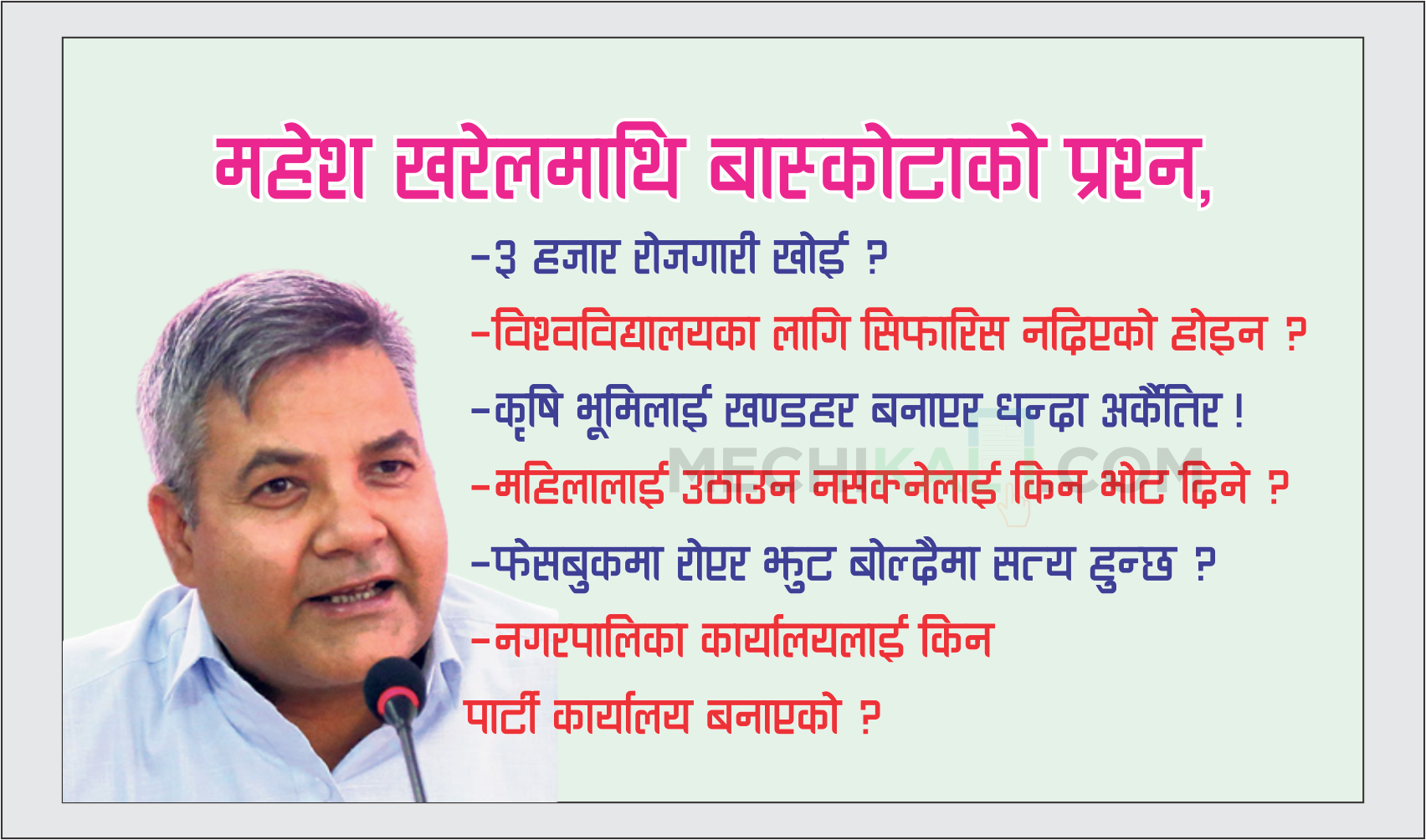 खोई त भट्टा हटेको ? स्थानीय पाठ्यक्रम किन बनेन ?पाँचखाल– पाँचखाल नगरपालिकाका निवर्तमान नगर प्रमुख हुन् महेश खरेल । उनको परिचय यत्तिमा मात्रै सीमित छैन, सामाजिक सञ्जालमा उनी सेलिब्र...