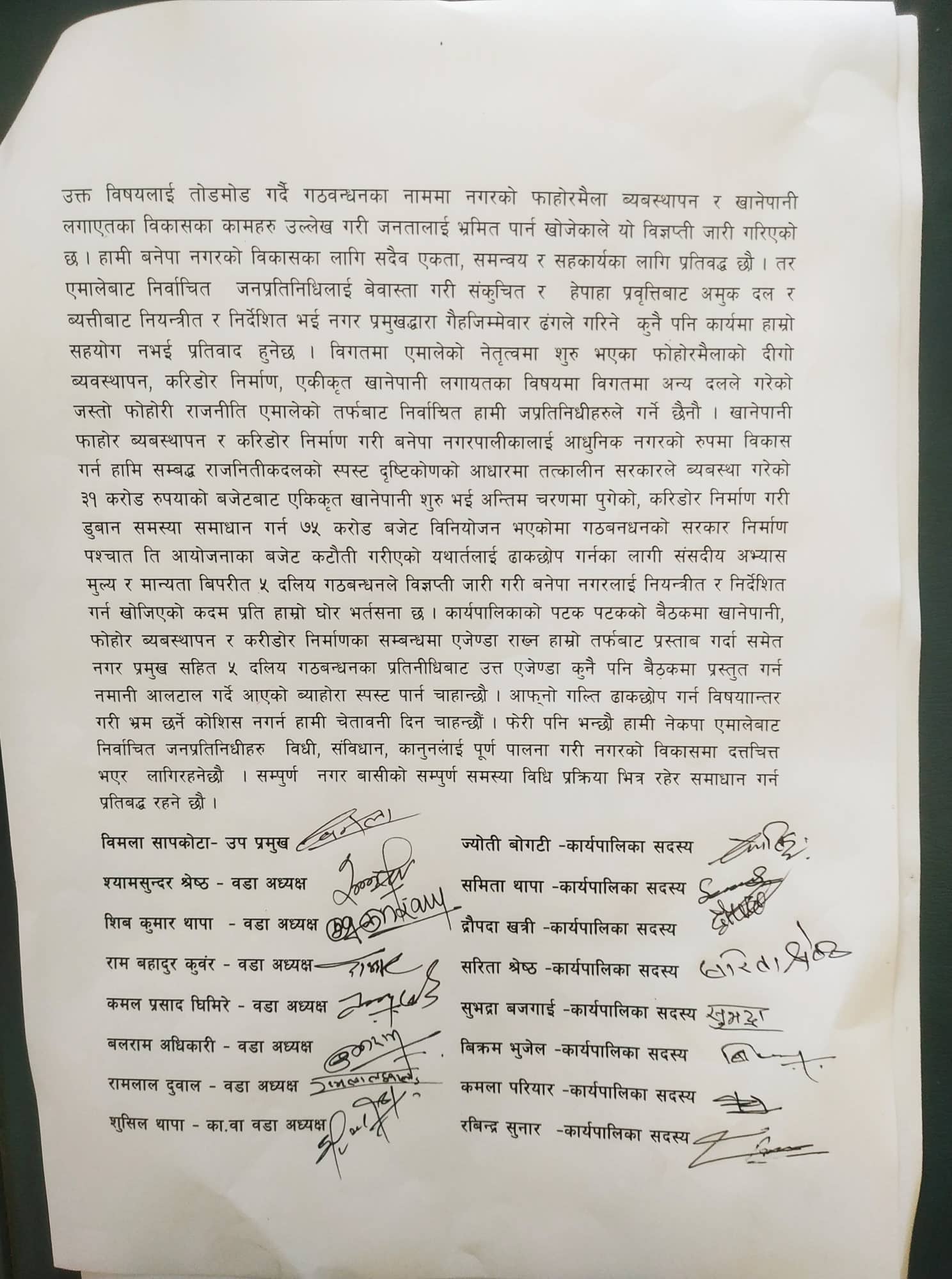 उक्त विषयलाई तोडमोड गर्दै गठवन्धनका नाममा नगरको फाहोरमैला ब्यबस्थापन र खानेपानी लगाएतका विकासका कामहरु उल्लेख गरी जनतालाई भ्रमित पार्न खोजेको एमालेका जनप्रतिनिधिहरुले बताएका छन् । आफूहरु बनेपा नगरको विकासका लागि सदैव एकता, समन्वय र सहकार्यका लागि प्रतिवद्ध रहेको भन्दै एमालेबाट निर्वाचित जनप्रतिनिधिलाई बेवास्ता गरी संकुचित र हेपाहा प्रवृत्तिबाट अमुक दल र ब्यत्तीबाट नियन्त्रीत र निर्देशित भई नगर प्रमुखद्धारा गैहजिम्मेवार ढंगले गरिने कुनै पनि कार्यमा आफूहरुको सहयोग नभई प्रतिवाद हुने चेतावनीसमेत उनीहरुले दिएका छन् ।