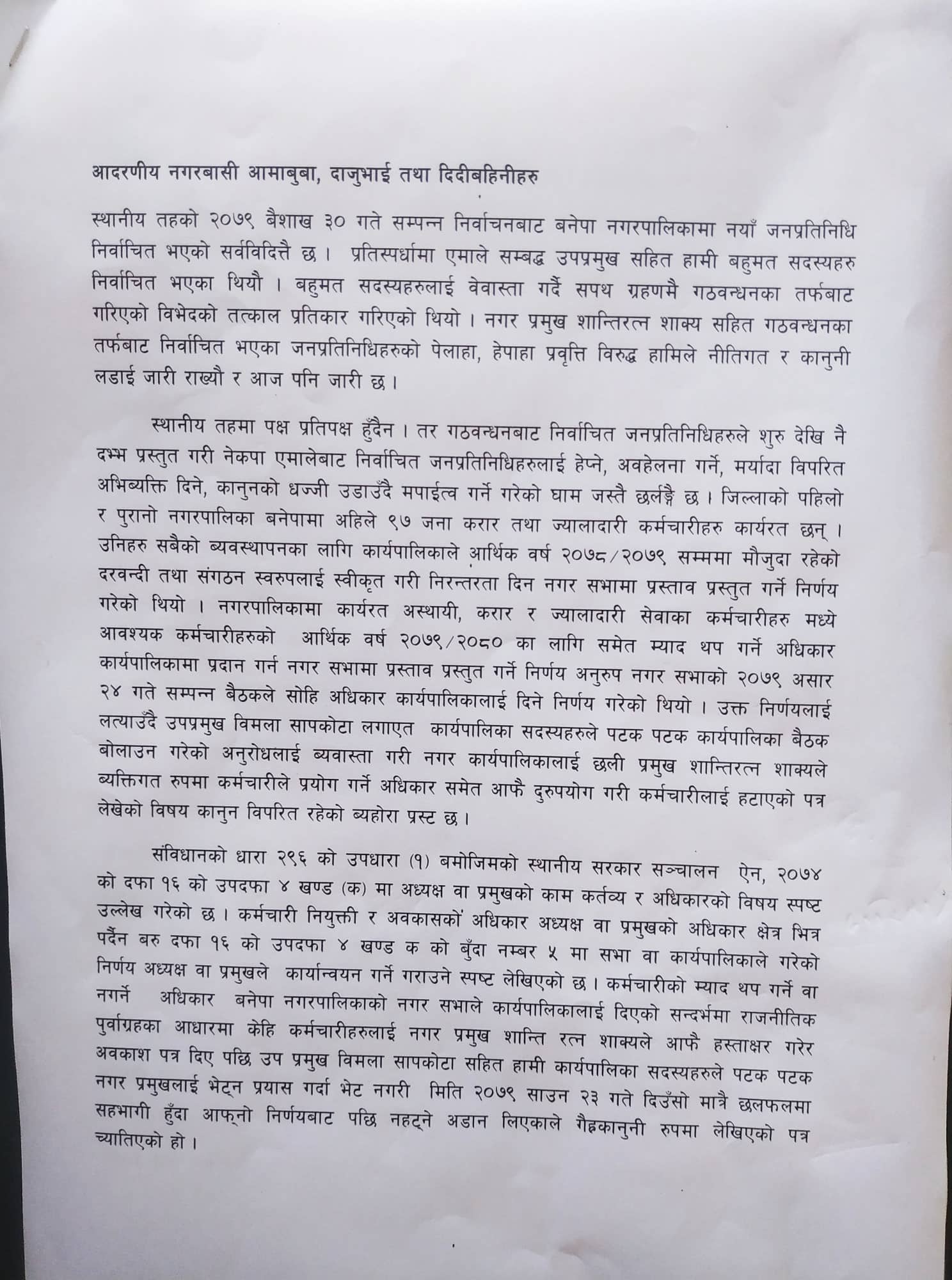 उक्त निर्णयलाई लत्याउँदै उपप्रमुख विमला सापकोटा लगायत कार्यपालिका सदस्यहरुले पटक पटक कार्यपालिका बैठक बोलाउन गरेको अनुरोधलाई ब्यवास्ता गरी नगर कार्यपालिकालाई छली प्रमुख शान्तिरत्न शाक्यले ब्यक्तिगत रुपमा कर्मचारीले प्रयोग गर्ने अधिकार समेत आफै दुरुपयोग गरी कर्मचारीलाई हटाएको पत्र लेखेको विषय कानुन विपरित रहेको जनप्रतिनिधिहरुको आरोप छ । कर्मचारीको म्याद थप गर्ने वा नगर्ने अधिकार बनेपा नगरपालिकाको नगर सभाले कार्यपालिकालाई दिएको सन्दर्भमा राजनीतिक पुर्वाग्रहका आधारमा केहि कर्मचारीहरुलाई नगर प्रमुख शान्ति रत्न शाक्यले आफै हस्ताक्षर गरेर अवकाश पत्र दिए पछि उप प्रमुख विमला सापकोटा सहित हामी कार्यपालिका सदस्यहरुले पटक पटक नगर प्रमुखलाई भेट्न प्रयास गर्दा भेट नगरी मिति २०७९ साउन २३ गते दिउँसो मात्रै छलफलमा सहभागी हुँदा आफ्नो निर्णयबाट पछि नहट्ने अडान लिएकाले गैह्रकानुनी रुपमा लेखिएको पत्र च्यातिएको विज्ञप्तिमा उल्लेख गरिएको छ ।