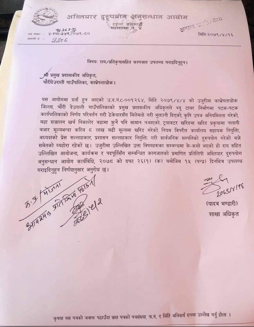 यस्तै कृषि उपज अनियमितता गरेको, वडा सञ्चालन खर्च निकालेर वडामा कुनै पनि सामान नआएको ट्रयाक्टर खरिदमा खरिद प्रकृयामा नलागी बजार मूल्यभन्दा करिब ८ लाख बढी मूल्यमा खरिद गरेको, नियम विपरीत कार्यालय सहायक नियुक्ति, अध्यक्षको प्रेस सल्लाहकार प्रशासन सल्लाहकार नियुक्ति गरी सार्वजनिक सम्पतिको दुरुपयोग गरेको भन्दै उजुरी गरिएको छ । उजुरीमा उल्लिखित उक्त विषयहरुका सम्बन्धमा के–कसो भएको हो राय सहित उल्लिखित आयोजना, कार्यक्रम र पदपूर्तिसँग सम्बन्धित कागजातको प्रमाणित प्रतिलिपी १५ दिनभित्र उपलब्ध गराउन अख्तियारका शाखा अधिकृत यादव भण्डारीले साउन १६ गते पत्र काटेका छन् । उक्त पत्र भदौ २ गते गाउँपालिकामा आइपुगेको छ ।
