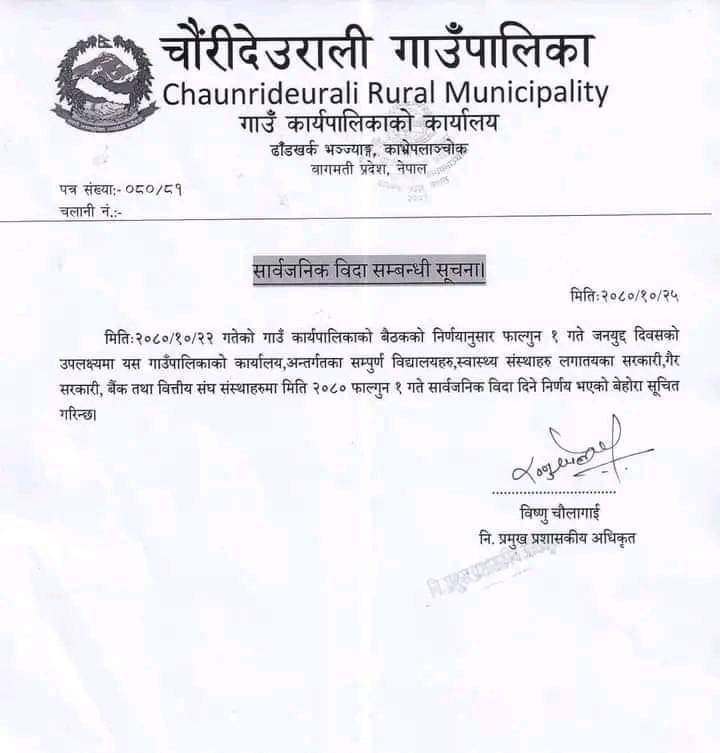 तर, सर्वोच्च अदालतले गरेको फैसलाविपरित काभ्रेको चौरीदेउराली गाउँपालिकाले फागुन १ गते जनयुद्ध दिवस भन्दै विदा दिने निर्णय गरेको छ । माघ २२ गते बसेको कार्यपालिकाको बैठकको निर्णयअनुसार भन्दै फागुन १ गते जनयुद्ध दिवसमा गाउँपालिका कार्यालय, अन्तर्गतका सबै विद्यालय, बैंक तथा वित्तीय संस्था लगायतमा विदा दिने निर्णय भएको गाउँपालिकाका निमित्त प्रमुख प्रशासकीय अधिकृत विष्णु चौलागाईंले आज जारी गरेको सूचनामा उल्लेख छ ।