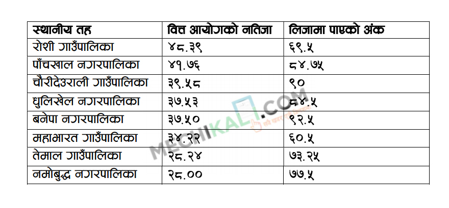 वित्त आयोग र लिजामा काभ्रेका स्थानीय तहको मुल्यांकन अंक यस्तो छ :