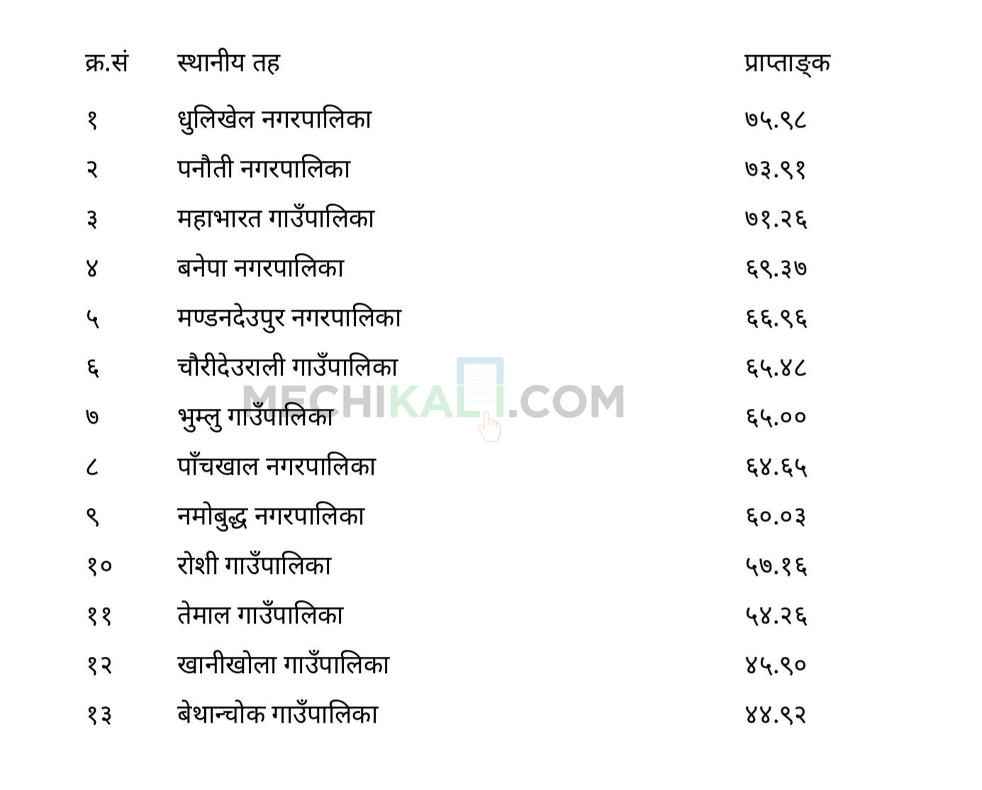 त्यसैगरी बनेपा नगरपालिका ६९.३७ अंकसहित चौथो स्थानमा रहेको छ भने मण्डनदेउपुर नगरपालिका ६६.९६ अंकसहित पाँचौं स्थानमा परेको छ। चौरीदेउराली गाउँपालिका ६५.४८ अंकसहित छैटौं, भुम्लु गाउँपालिका ६५.०० अंकसहित सातौं र पाँचखाल नगरपालिका ६४.६५ अंकसहित आठौं स्थानमा रहेका छन्।